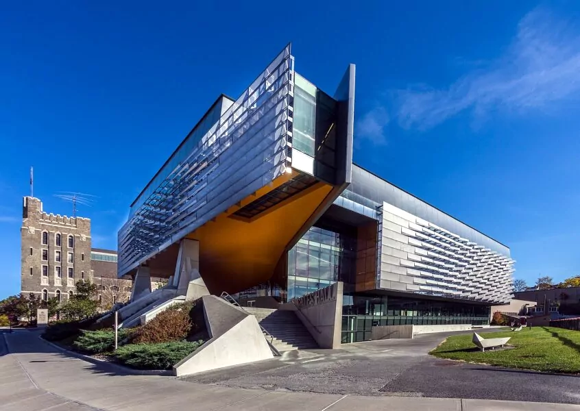 Zde je budova Cornellovy univerzity s příhodným názvem „Sál Billa a Melindy Gatesových“, kterou projektoval Mayne: