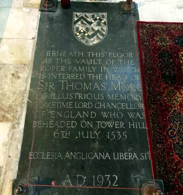 Od doby, kdy milující dcera svatého Tomáše Margaret Roperová hlavu svého otce-mučedníka v roce 1535 odvážně zachránila z Londýnského mostu a dala pohřbít ve vlastní rodinné hrobce, zůstává relikvie v podzemí boční kaple kostela sv. Dunstana, který byl kdysi katolický, ale od reformace patří anglikánské církvi. Relikvie byla vždy skrytá před pohledem zvenčí, zakrytá a uzavřená pod pamětní deskou v podlaze.