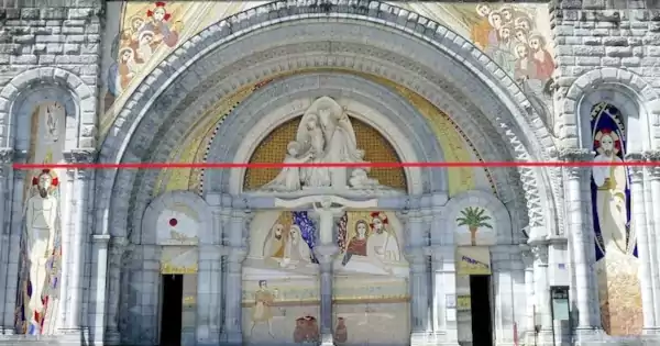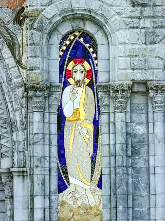Zde je to, co mám na mysli – jeho dílo na fasádě lurdské baziliky: