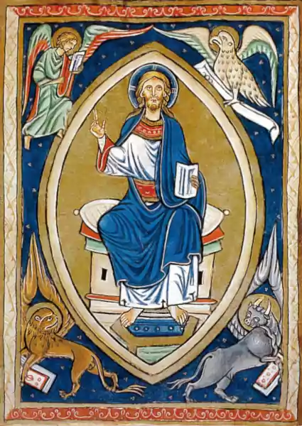 Stránka románského rukopisu ze 13. století (Pontifikál z Chartres), zobrazující Krista Pantokratora v mandorle.