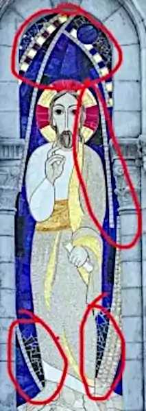 Hlavním rysem katolického falešného primitivismu 70. let je záměrná asymetrie. Tradičně by linie měly ladit a dávat geometrický vizuální smysl. Jeho linie jsou však křivolaké a nic nám neříkají. (Přidala jsem červené čáry, aby to bylo jasné.) Kristus při křtu vlevo je zřejmě náhodně nižší než Kristus při proměnění (možná?) vpravo.